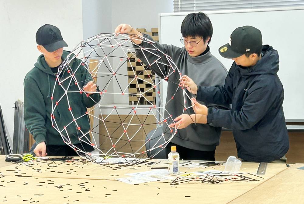 学生がこの内容で研究することになった背景には、学部3年生後期の建築デザインスタジオの授業で、ストローを用いて直径約80cmのジオデシックドームを学生自身が組み立てた経験が少なからず影響しているものと思われます。