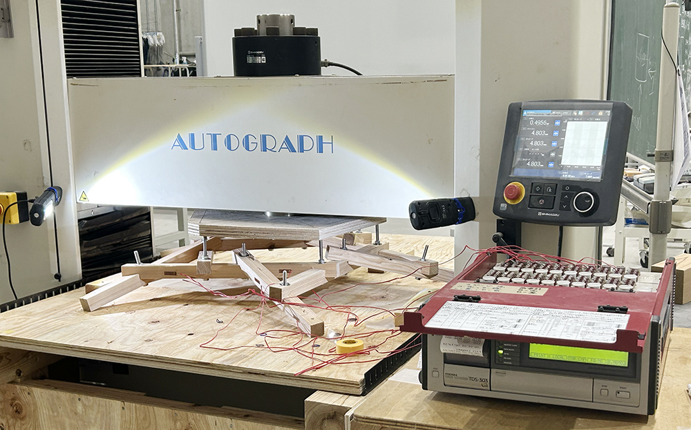 また学生たちといっしょに、一つのレシプロカルユニットを取り上げて、万能試験機を用いた鉛直載荷試験を行いました。