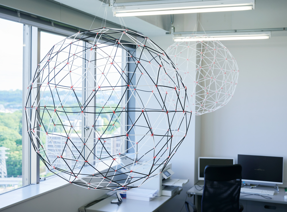 学生たちがストローで制作した直径80cmのジオデシックドーム模型。3Dプリントした接合部を使い、構造の成り立ちを体験的に学んだ。
