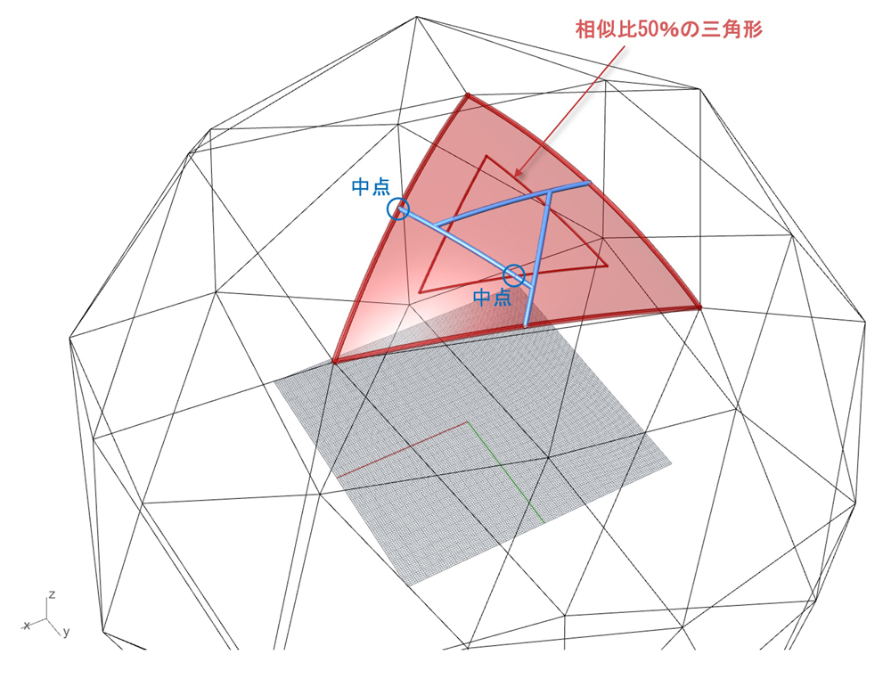 ジオデシックドームは、三角形のグリッドから構成されるため、その三角形を利用して比率(論文では「相似比」と呼んでいる)を、任意に変えることのできる小さい相似形の三角形を中心に配置し、内外の二つの三角形の中点を通る線分を延長して、交差する点でとめることで、レシプロカル・フレームの部材を配置する位置が決まります。