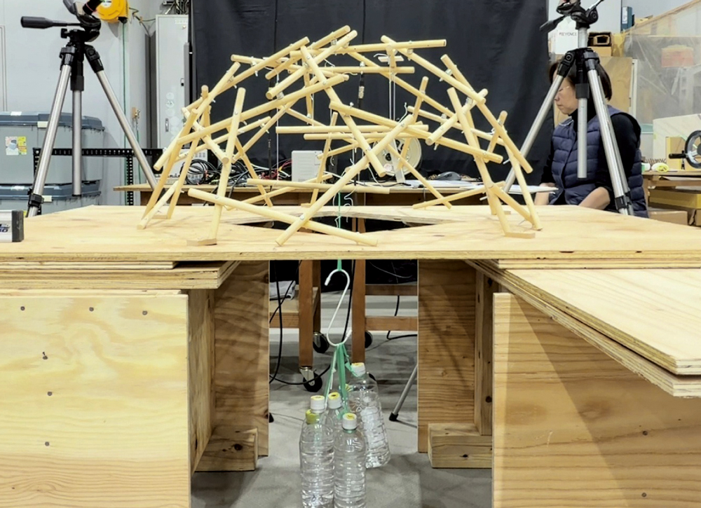 この実験を通して、レシプロカルユニットの「靭性(ねばり強さ)」、そして「冗長性(ある部分が壊れても、力が再配分されてまだ力に耐えることができること)」が高いことを確認することができました。