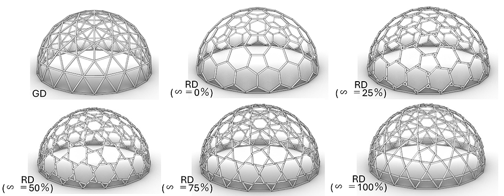 相似比(図中、∽)というパラメータ化により、この値を変えることで同じ球面に対して多様な部材レイアウトが生まれます。そして、この方法により構造最適化を行うことも可能となります(詳細は上記論文をご参照ください)。
