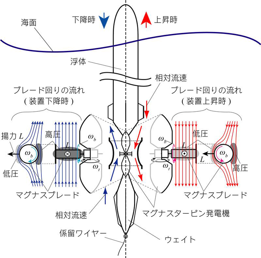 現在取り組んでいる「マグナス効果を用いたポイントアブソーバ型波力発電装置」は、円柱形状のタービンブレード(羽根)をモータで正転・逆転させ、その自転によって発生する揚力を制御することにより、不規則な波の上下運動から得られる力を一定方向の回転運動へと変換し、これにより回転する発電機で電力を得る装置です。
