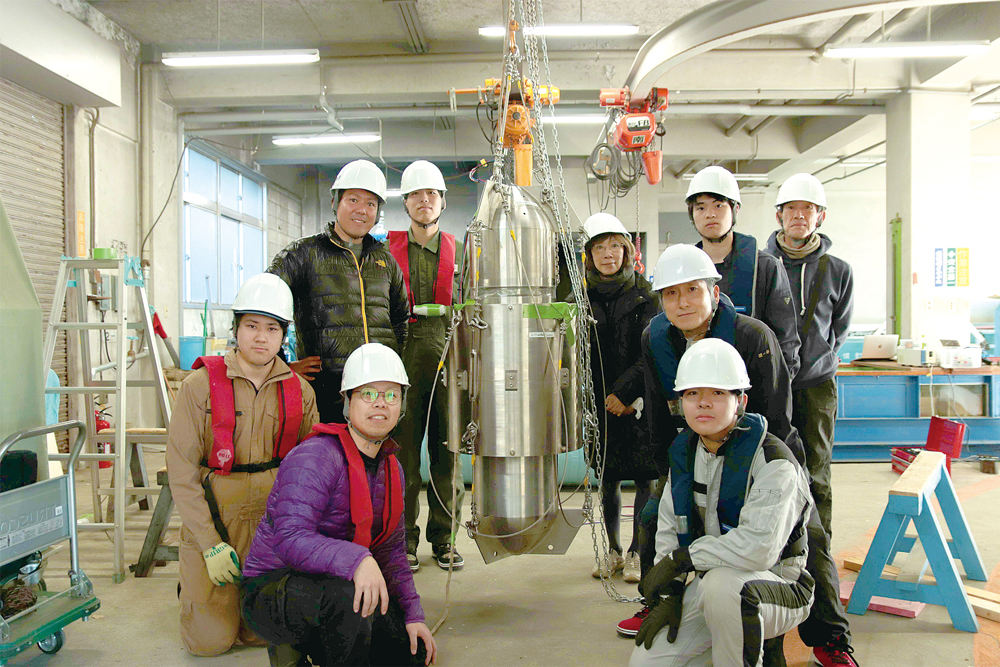 海上技術安全研究所で、タービンを囲んで学生や企業関係者と撮影した集合写真(右側中段に山下教授)