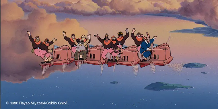 宮崎駿さん・スタジオジブリの描く乗り物は楽しい。空飛ぶ系の乗り物の豊かさには目を見張る。ただものではない豚さんが無人島に暮らし、仕事に、外食に、決闘にも赤い飛行艇(『紅の豚』)で出かける。個人ユースの空飛ぶ乗り物には大きな憧れを抱く。カリオストロの伯爵が利用するオートジャイロ(『ルパン三世カリオストロの城』)は現実にも存在するかもしれないので、お金持ちになれればぼくにも乗れる可能性はある。風を読む職人的な技を必要とするメーヴェ(『風の谷のナウシカ』)は幼少期から訓練が必要なようだ。フライングカヤック(『ハウルの動く城など』)など、羽ばたく乗り物は多くあるが、特にぼくはフラップター(『天空の城ラピュタ』)の飛行メカニズムに惹かれる。少々間抜けな荒くれ兄弟達が乱暴に操縦しているフラップターは、連結した後方の機体でも構わないので、一度、体験飛行させていただきたい。しかし、羽ばたく、つまり飛ぶために羽を上下に動かす機構はとても難しい。パズー氏がシータさんに見せた開発中の空飛ぶ乗り物は、はばたく鳩のおもちゃを、人が搭乗可能な大きさでの実現を狙ったものである。これはゴム動力で、鳥の胴体内でねじられたゴム紐が軸を回転させ、その軸に繋がるクランク機構で左右2枚の羽をパタパタと羽ばたかせることで空を飛ぶ。ただし、空賊の飛行船での旅先で当初の目的を達成したため、その後の開発状況は不明である。